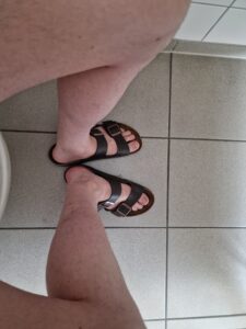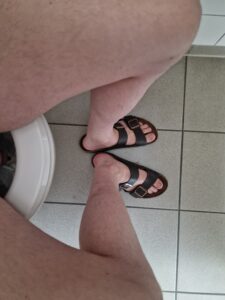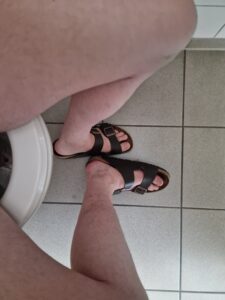 Very quick exposing at the office toilet – wearing nothing but my offices Birkenstocks for this specific business.